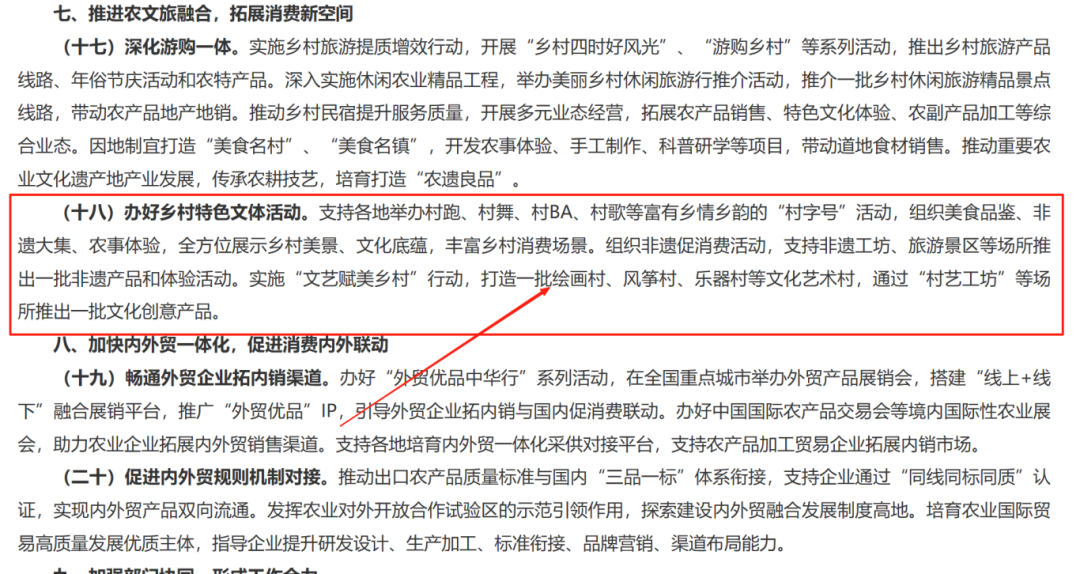 近日,农业农村部、国家发展改革委、教育部、工业和信息化部、商务部、文化和旅游部、国家卫生健康委、市场监管总局、体育总局、国家知识产权局等十部门,联合印发《促进农产品消费实施方案》。 ![]() 深化游购一体。实施乡村旅游提质增效行动,开展“乡村四时好风光”、“游购乡村”等系列活动,推出乡村旅游产品线路、年俗节庆活动和农特产品。深入实施休闲农业精品工程,举办美丽乡村休闲旅游行推介活动,推介一批乡村休闲旅游精品景点线路,带动农产品地产地销。 ![]() 推动乡村民宿提升服务质量,开展多元业态经营,拓展农产品销售、特色文化体验、农副产品加工等综合业态。因地制宜打造“美食名村”、“美食名镇”,开发农事体验、手工制作、科普研学等项目,带动道地食材销售。 办好乡村特色文体活动。支持各地举办村跑、村舞、村BA、村歌等富有乡情乡韵的“村字号”活动,组织美食品鉴、非遗大集、农事体验,全方位展示乡村美景、文化底蕴,丰富乡村消费场景。 ![]() 组织非遗促消费活动,支持非遗工坊、旅游景区等场所推出一批非遗产品和体验活动。实施“文艺赋美乡村”行动,打造一批绘画村、风筝村、乐器村等文化艺术村,通过“村艺工坊”等场所推出一批文化创意产品。 |